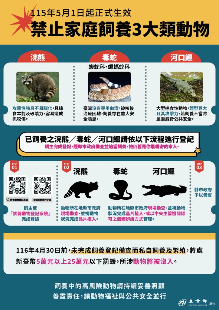 為強化源頭管理並維護公共安全,農業部今(10)日正式公告修正「指定禁止飼養輸入或輸出之動物」,明定自民國115年5月1日起,禁止國人飼養包含浣熊、河口鱷、蝮蛇科及蝙蝠蛇科等共641種具高度危險動物。農業部強調,為保障既有飼主權益,凡於公告生效前已飼養上述動物者,仍可繼續飼養,但務必於規定期限內向動物所在地縣市政府辦理登記備查。