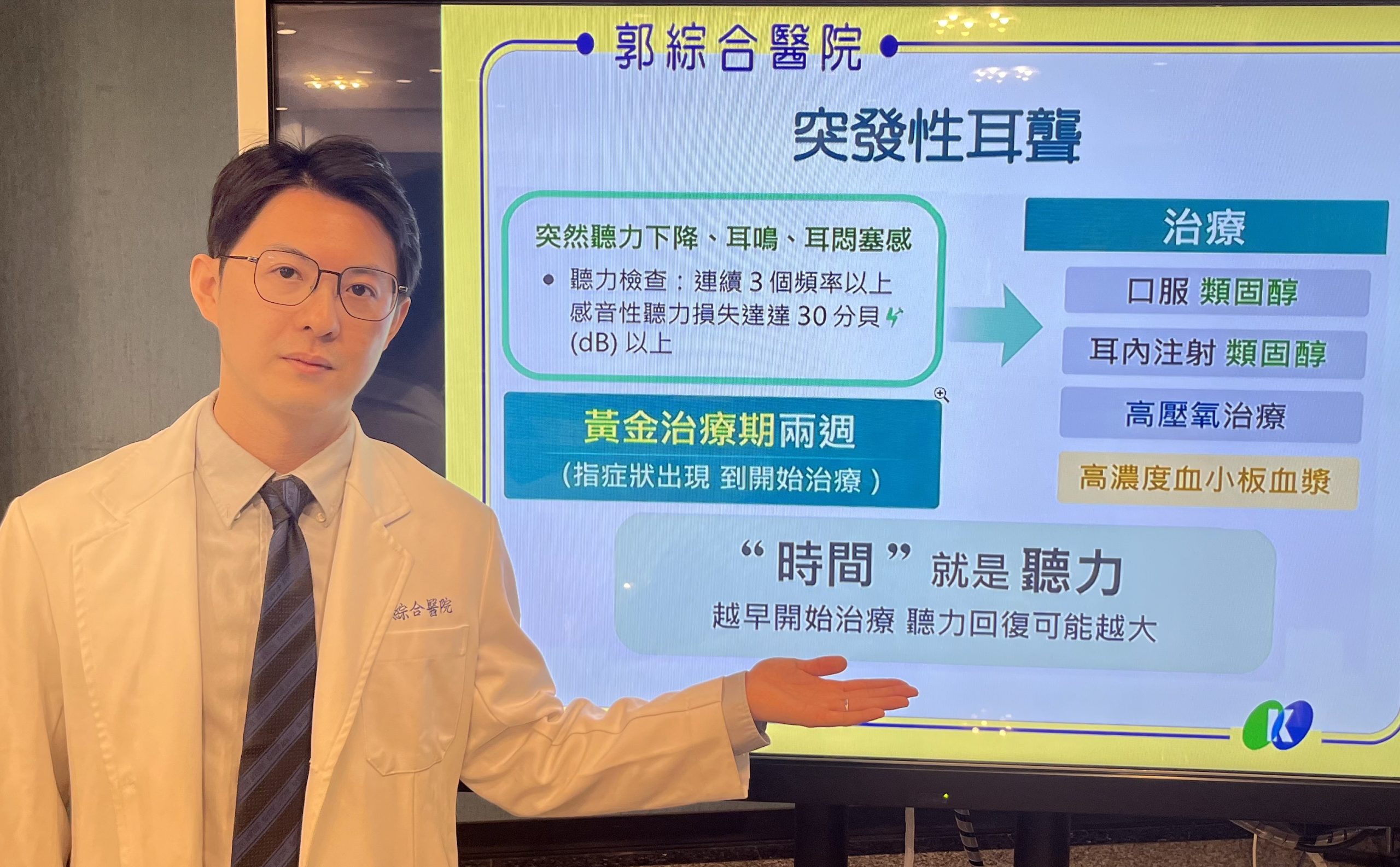 郭綜合耳鼻喉科醫師郭亮寬說明「時間就是聽力」,越早開始治療,聽力回復可能越大。(記者陳治交攝)