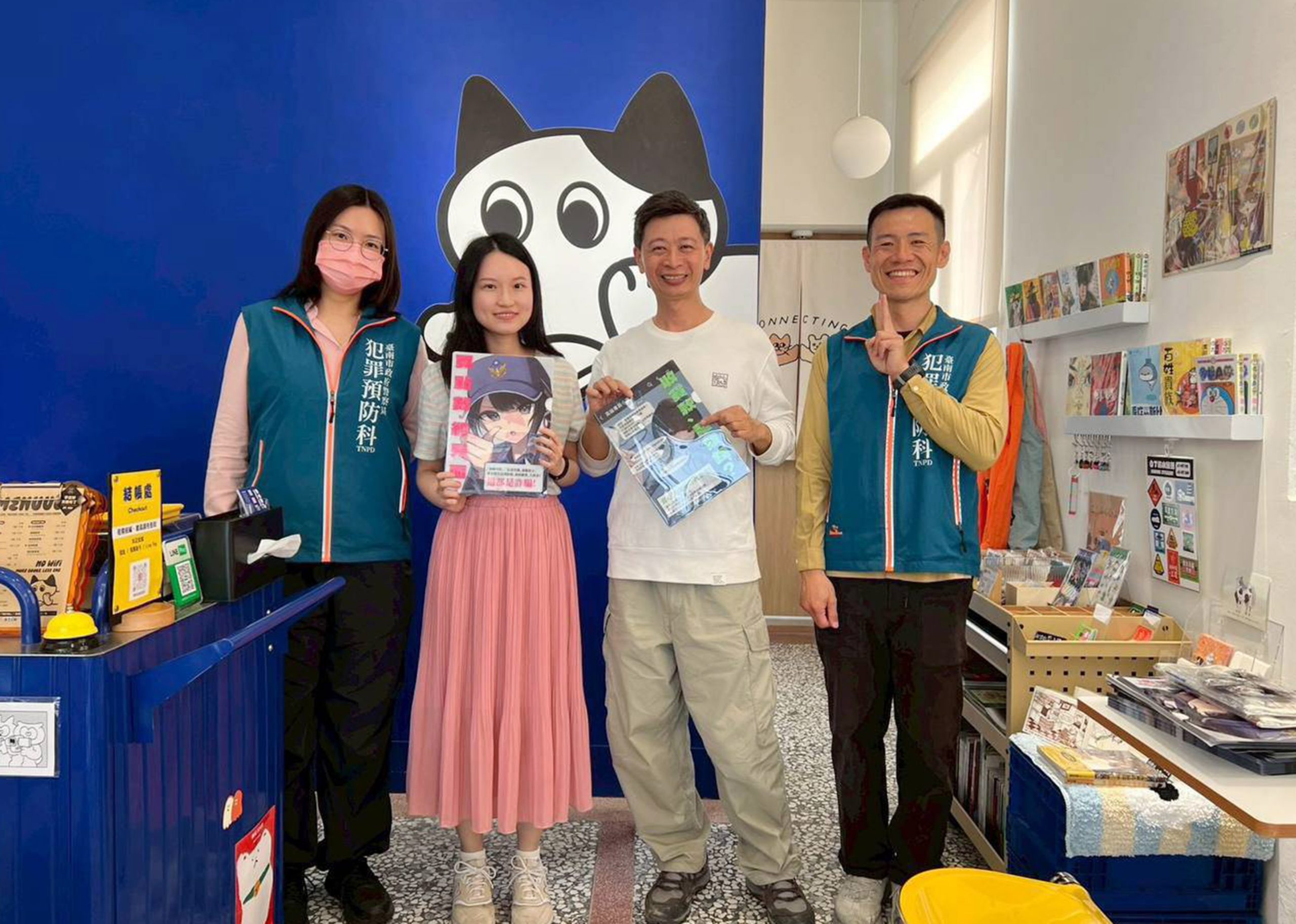 南市警察局防詐宣導,和位於白河區的獨立書店「白丁書店」跨界合作,將市警局員警設計的動漫風格防詐資料夾,提供民眾索取,讓犯罪預防觀念進入青年生活場域加強宣導。