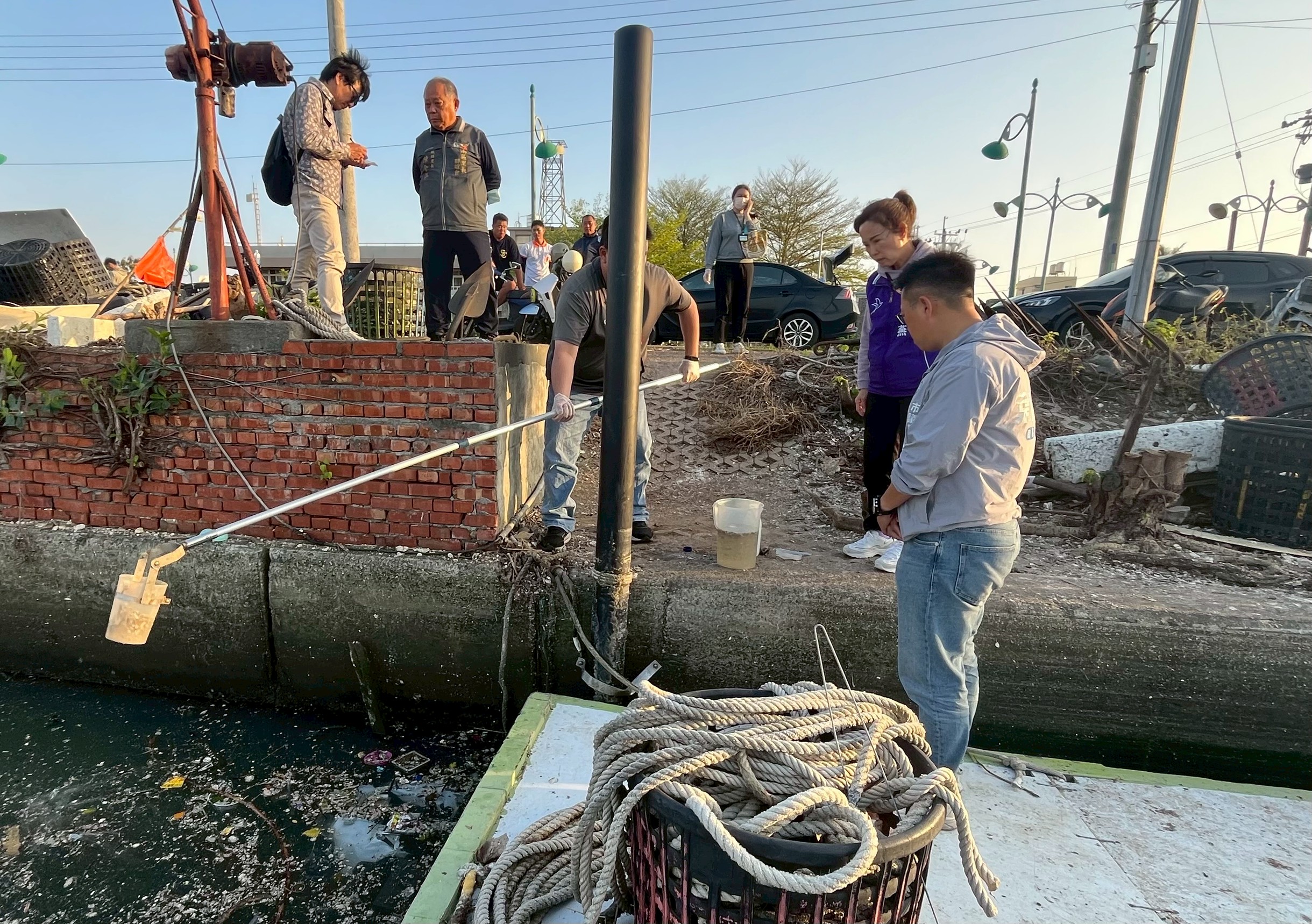 南區四鯤鯓漁港碼頭南側水域近來布滿顏色怪異的粉狀殘渣異物,甚至夾雜著吳郭魚及綠鬣蜥死屍,令漁民驚恐,議員林美燕和服務處執行長葉翰勳緊急邀集相關單位會勘,環保局現場採樣檢驗水質,將再逐步追查真相。