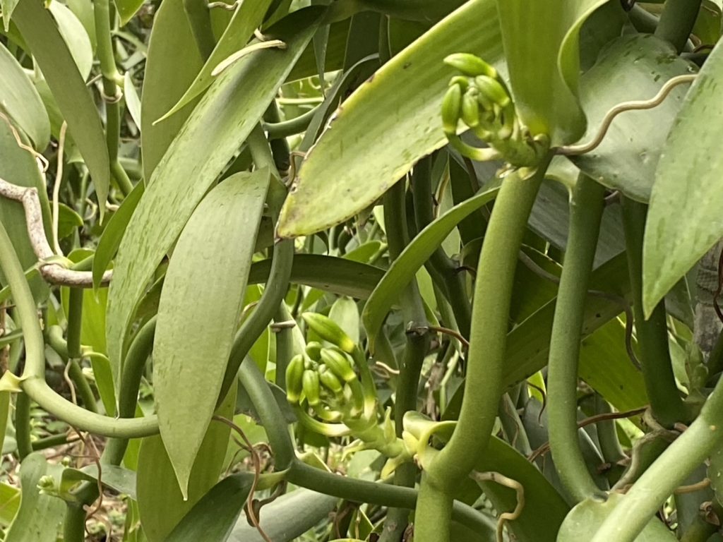 現在正是香莢蘭即將開花的季節,在玉井種植香莢蘭十年的尤建驊,不論是人工授粉的速度一小時可達六百朵花外,在其後製也有一套自行摸索研究的好方法。由於香莢蘭要長得好,理蔓是必要的過程,因此連月來,馥悅農場都忙著理蔓,不希望長出的花苞太多,花苞太多香莢就多,但莢果就會長得不理想,所以理蔓就等於疏果,是種植香莢蘭必要又重要的工序。