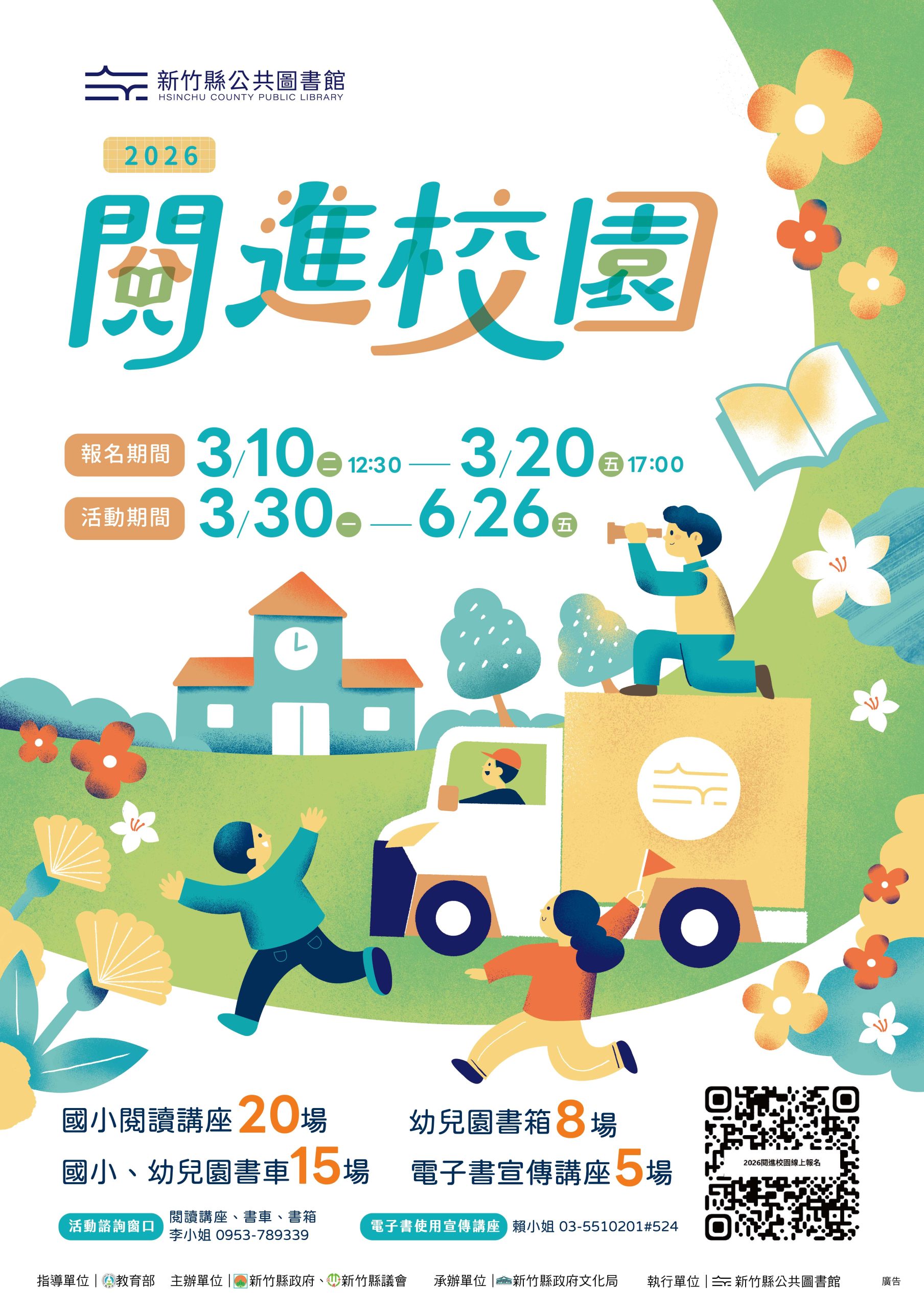 一一五年上半年度「新竹縣閱進校園暨行動書車活動」,預計為縣內國小及幼兒園辦理二十場校園講座、十五場行動書車校園巡迴及八場次校園「新書共讀箱」,即日起至二十日下午五時止,歡迎各國小及幼兒園踴躍報名參加。
