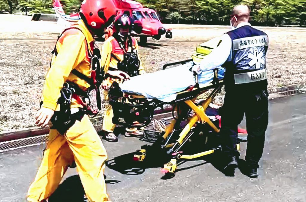 高雄市消防局第六救災救護大隊急向空總申請直升機吊掛救援,12時24分直升機降落屏東朧祥公園,12時30分由美濃消防分隊救護車將患者後送義大醫院治療。