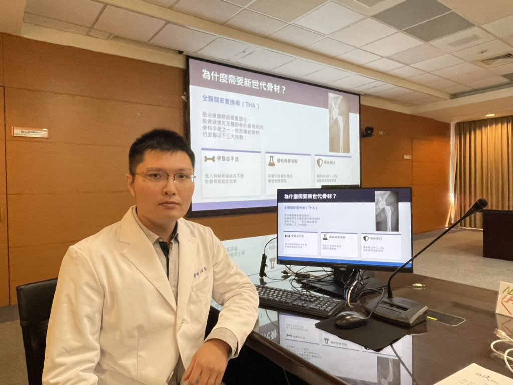 醫師周益全指出,新世代人工髖關節骨材結合3D列印髖臼杯、維生素E聚乙烯內墊及雙動關節系統,有助提升關節穩定度與耐用性。(記者林怡孜攝)