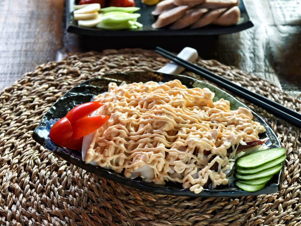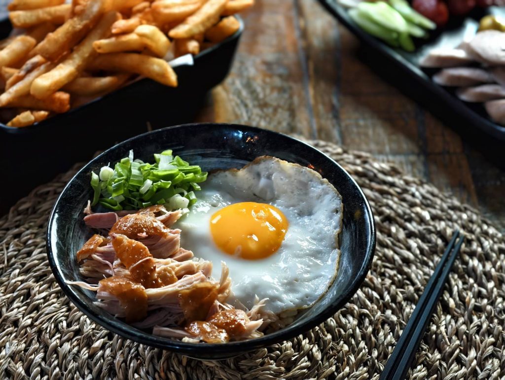 同樣豪邁上桌的「異塵雞絲飯」,份量絲毫不因酒吧而縮減。異塵始終相信,一頓完整的料理能讓夜晚更有溫度。使用甕仔雞肉入饌,捨去常見雞油拌飯做法,改以日式和風醬調味,半熟蛋液傾流而出,入口滿是淡淡煙燻香氣。經典「香腸雙拼」網羅台式香腸與德國白香腸,雙重享受一次滿足,白香腸蘸佐Develey風味一絕。今天的「明太子軟絲」直接擄獲我的味蕾,彈嫩軟絲配上自製明太子醬,完整保留大海鮮味。