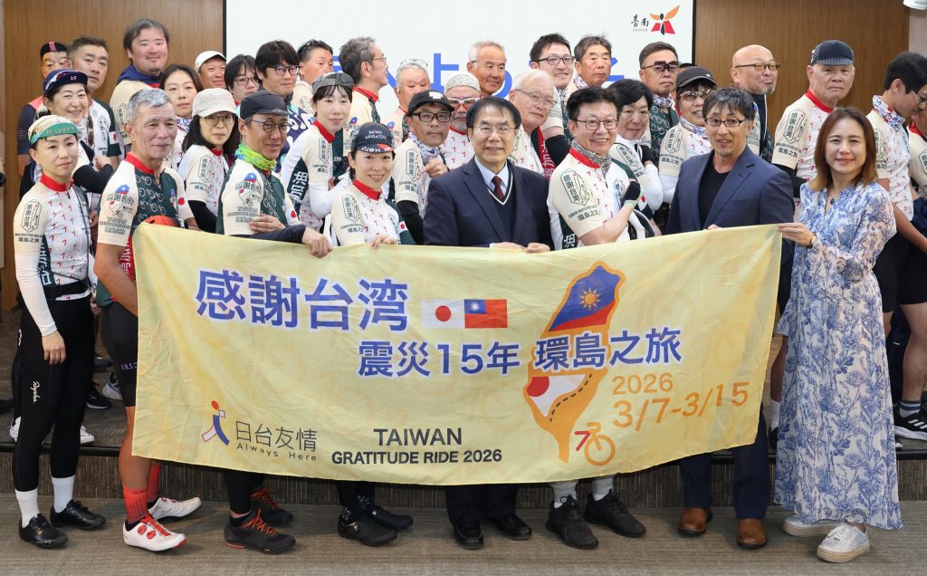 「東日本大地震十五週年自行車環台感謝之旅」團隊十二日行抵台南,市長黃偉哲非常感謝團長一青妙發起此次活動,以行動力挺台日友好,台日之間的友誼不可言喻。