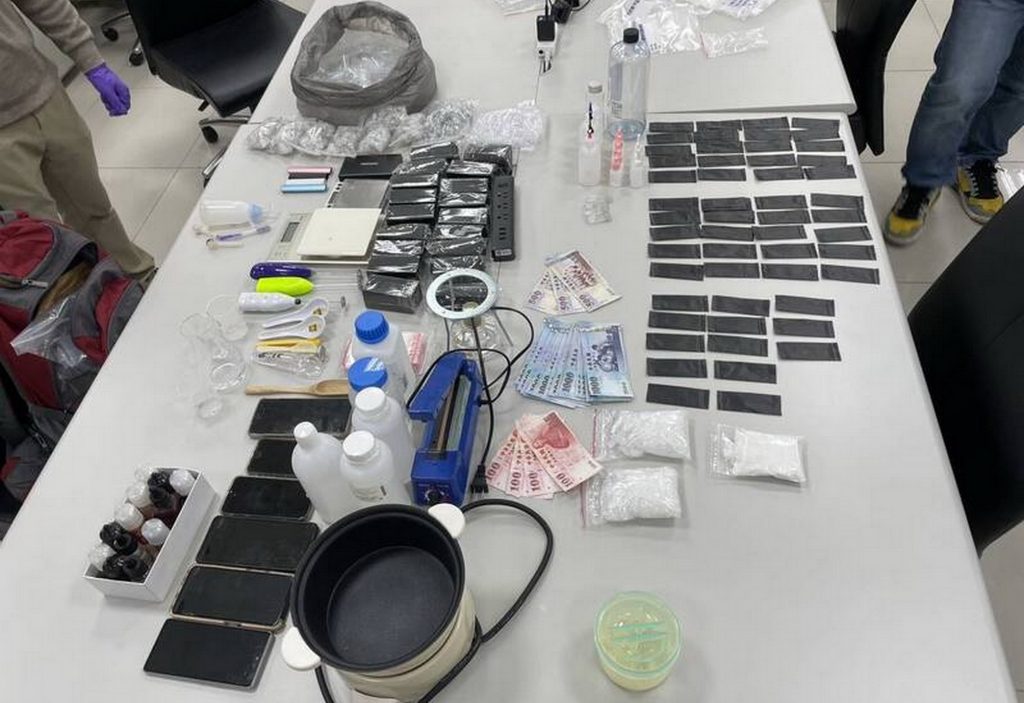 警方唯恐發生駁火危險,當機立斷丟出震撼彈壓制,瞬間巨響伴隨煙霧充滿室內,特警趁機衝入臥室,迅速將郭男壓制在地並上銬逮捕,隨後在屋內查獲改造手槍二把及子彈十六顆,並起出安非他命、依托咪酯、卡西酮與毒品咖啡包等大量毒品及分裝器具,另查扣販毒所得二萬四千九百元,全案詢後依槍砲及毒品等罪嫌移送台中地檢署偵辦,並將持續向上追查槍彈來源。