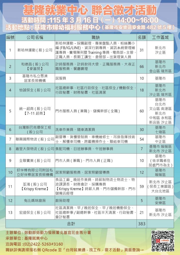 勞動部勞動力發展署北分署基隆就業中心將於三月十六日(星期一)下午兩點至四點,在基隆市婦幼福利服務中心舉辦社區聯合徵才活動,邀請十三家優質廠商,提供近三百八十三個工作機會。