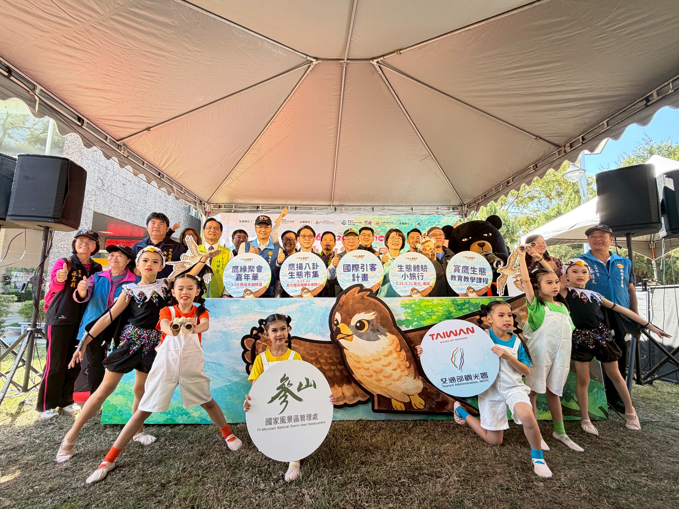 參山處指出,「鷹緣聚會嘉年華」十四日在南投橫山賞鷹平台旁的赤腳精靈舉行。二十一、二十二日彰化縣政府於芬園鄉文德國小舉辦「鷹揚八卦之八卦松林大角頭」活動;彰化縣野鳥學會也將同步展開灰面鵟鷹過境調查與賞鷹散步行導覽。