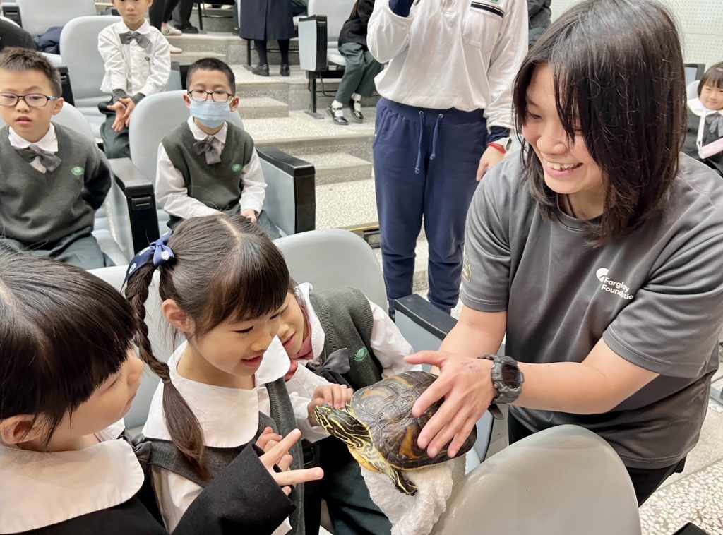 在花蓮舉辦的課程也展現了在地辦理的優勢。由於路程不似前往雙北地區遙遠,活動能帶來更多豐富的教學資源。除了超人氣的紅腿象龜「雪中紅」,更加入了新助教「黃腹彩龜」,保育員此次更特別攜帶狗鯊卵鞘及海星走進校園,讓教室瞬間化身為小型水族館。課堂上,學童們透過透明的狗鯊卵鞘,近距離觀察胚胎與內部卵黃構造,驚嘆卵鞘孕育生命的奇妙過程。
