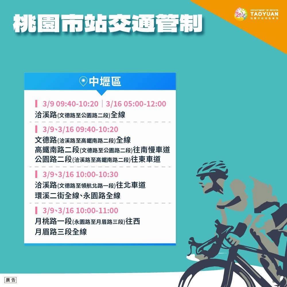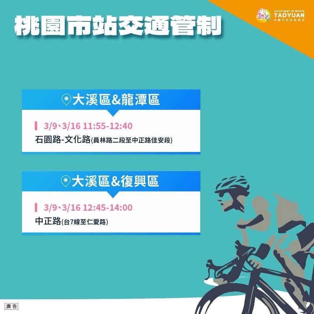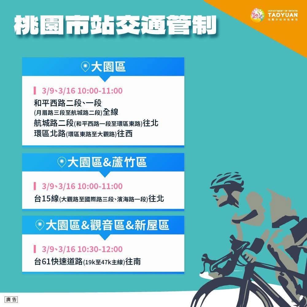 為迎接年度國際體壇盛事國際自由車環台賽,桃園市警察局前於3月9日辦理賽事交通管制與安全維護實警演練,針對競賽當日車隊行經路線、重要路口管制、人車分流及緊急應變等項目進行完整演練。整體勤務過程順暢,相關交通疏導及管制作為均依規劃完成,為3月16日正式競賽奠定良好基礎。
