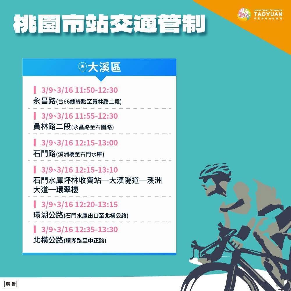 交大隊長林東星提醒,3月16日正式競賽當天,車隊行經路段將採取「移動階段性」交通管制方式進行,以確保選手安全並降低對民眾交通影響。當車隊即將抵達時,警方將先行管制路口車輛通行,待車隊通過後即逐步解除管制,整體管制時間相對短暫,請用路人耐心配合現場員警及義交人員指揮。