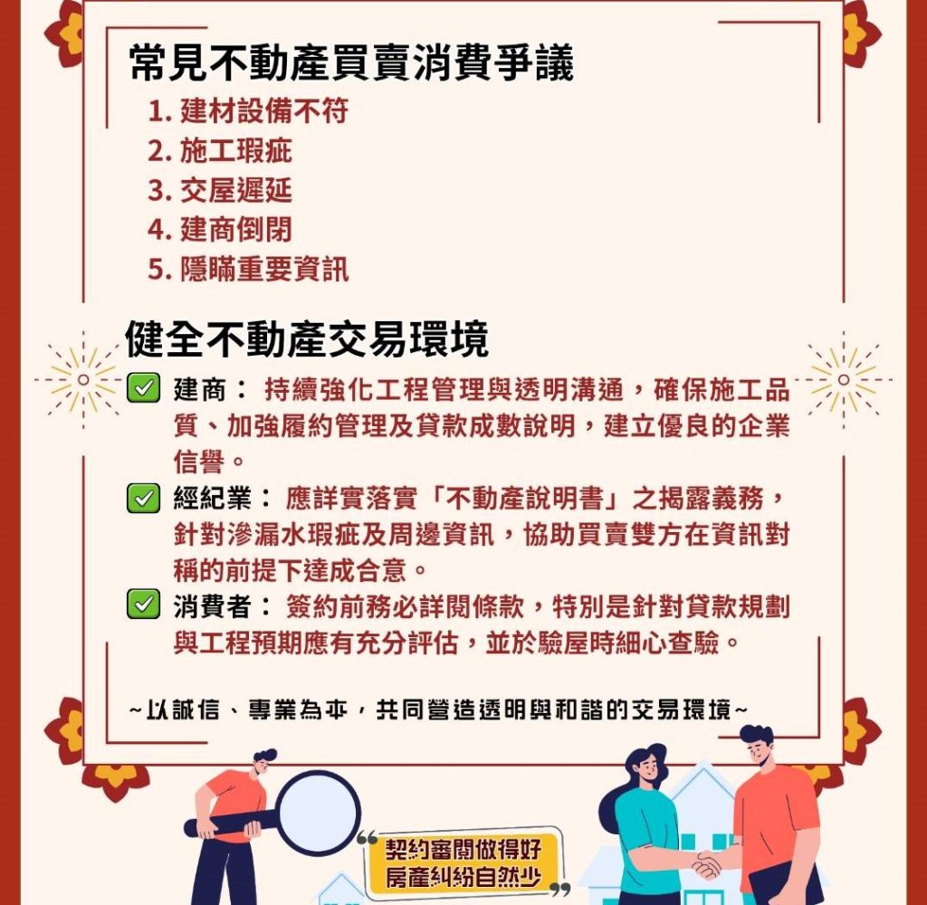 法制處統計指出,去年全市不動產買賣消費爭議前五大類型分別為建材設備不符(六十五案)、施工瑕疵(六十一案案)、交屋遲延(五十四案)、建商倒閉(三十二案)及隱瞞重要資訊(十九案),共計二百三十一案。消費者購屋前應審慎選擇體質穩健、信譽良好的業者,並務必善用「契約審閱權」,詳閱條款內容,以確保自身權益。