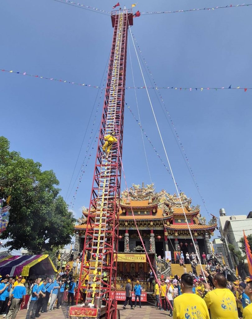 屏東縣東港鎮無極濟賢寺十四日在鎮海宮廣場舉行登一百零八層釘刀梯受爵法會,七名乩生(乩童)由通引官前導,攀登高約三十五公尺的釘刀梯奏稟上蒼,完成受爵考驗。