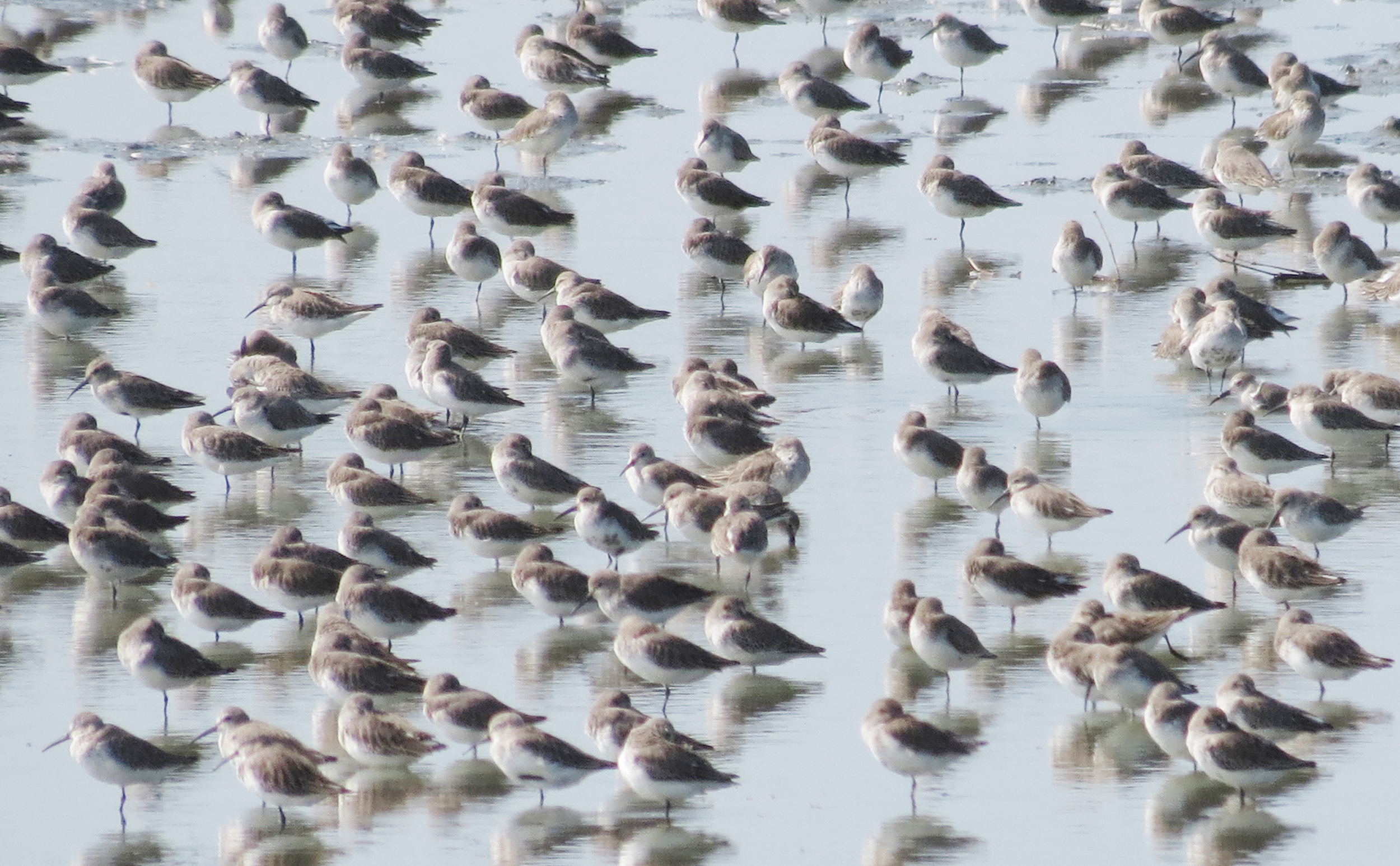 台南沿海濕地出現大群鷗科候鳥,似乎剛完成一段長途旅程,矗立在灘地棲息,不是縮著頭歇息,就是整理羽衣,還有黑腹濱鷸、紅胸濱鷸、青足鷸、金斑鴴、鐵嘴鴴,鳥況十分熱鬧。