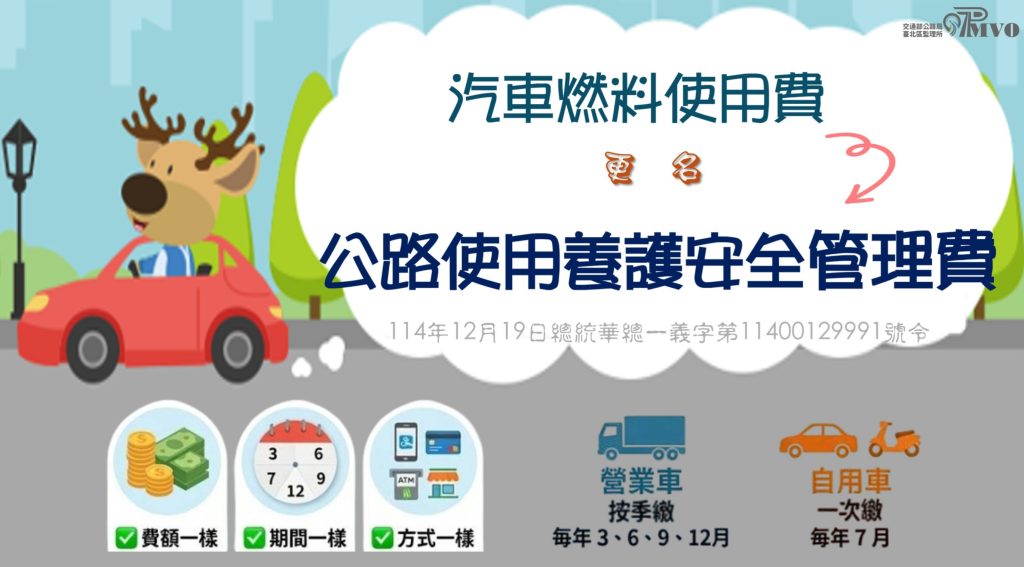 《公路法》部分條文於去(114)年12月19日公布修正,「汽車燃料使用費」更名為「公路使用養護安全管理費」(簡稱「公路養管費」),改名後讓民眾一眼就能看懂徵收用途是作為公路養護、修建及安全管理使用。而且開徵期間、繳費方式及繳納金額均維持不變。