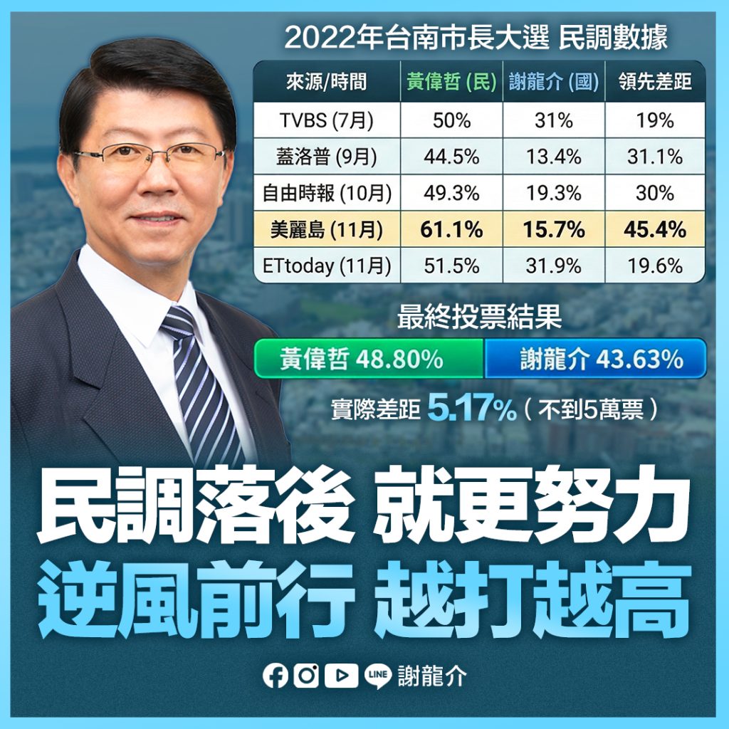 謝龍介表示,2022年M他首次參選台南市長,民調比今年更加不看好,平均落後3成,甚至到了要投票的11月,還有民調做出我輸45%,最終我只以5%惜敗。