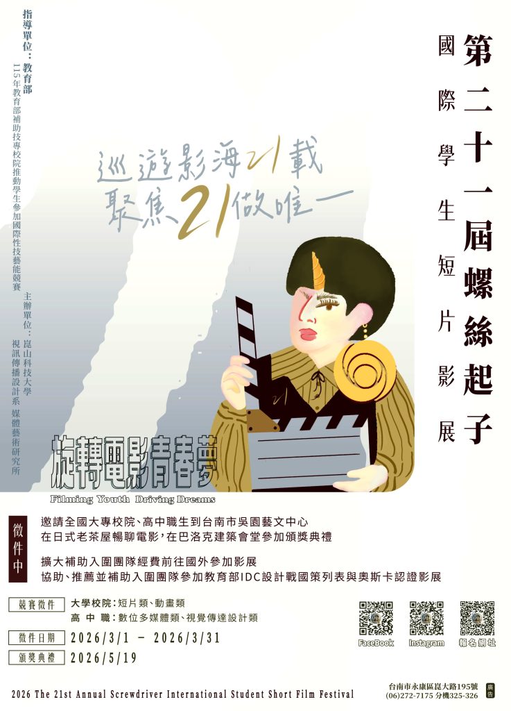 崑山科大視訊傳播設計系主辦一一五年教育部補助技專校院推動學生參加國際性技藝能競賽-「第廿一屆螺絲起子國際學生短片競賽影展」開始徵件,提供從事影像創作之海內外大專院校、高中職在生及研究生發揮實力舞台,徵件至三月卅一日截止,歡迎參賽投件。