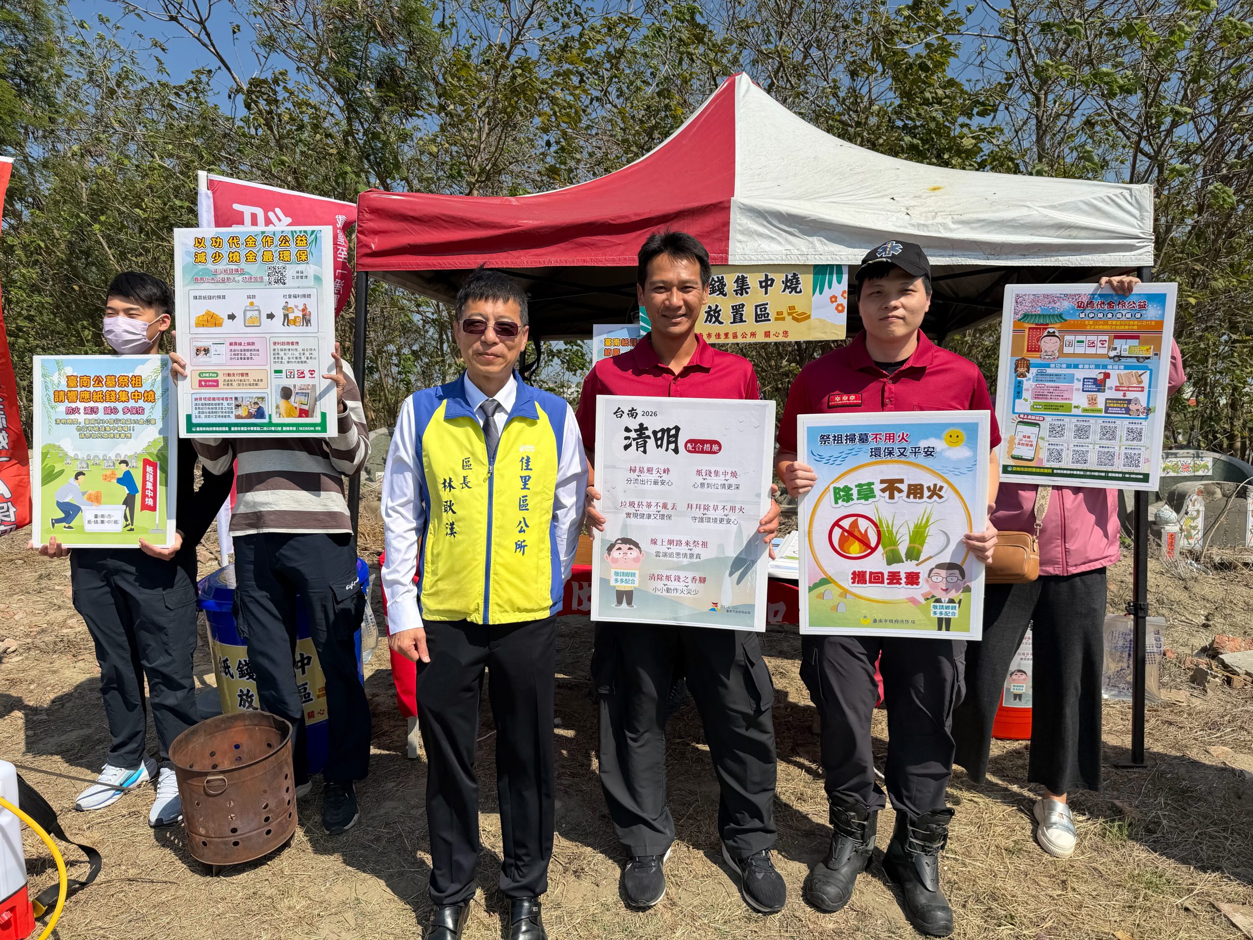 響應「以功代金」及「紙錢集中燒」政策,佳里區公所在第四公墓主要路口設置紙錢集中區,另鼓勵民眾省下金紙費用轉作善款,不僅為祖先積累功德,更能落實環保減碳。