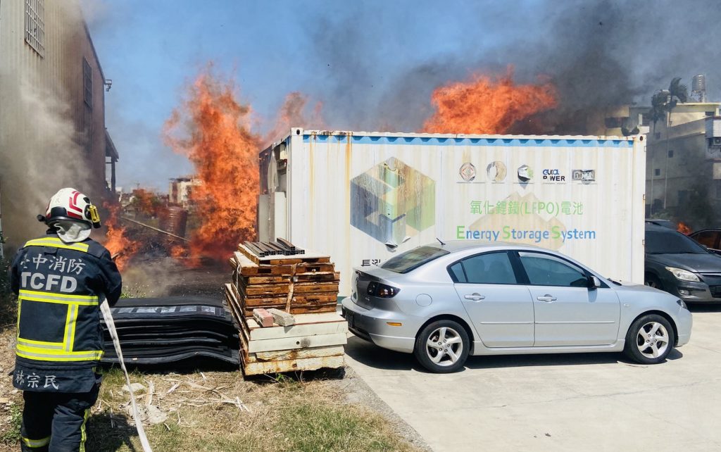 火勢於下午一時十四分撲滅,現場為停車場內木棧板延燒到儲能貨櫃屋內些微雜物,貨櫃屋內未堆放危險物品、為放置雜物,一輛小貨車全毀、二輛轎車半毀,其車輛行李箱受燒,燃燒面積約五十平方公尺、無人員受傷,後續起火原因交由火調人員鑑定調查中。