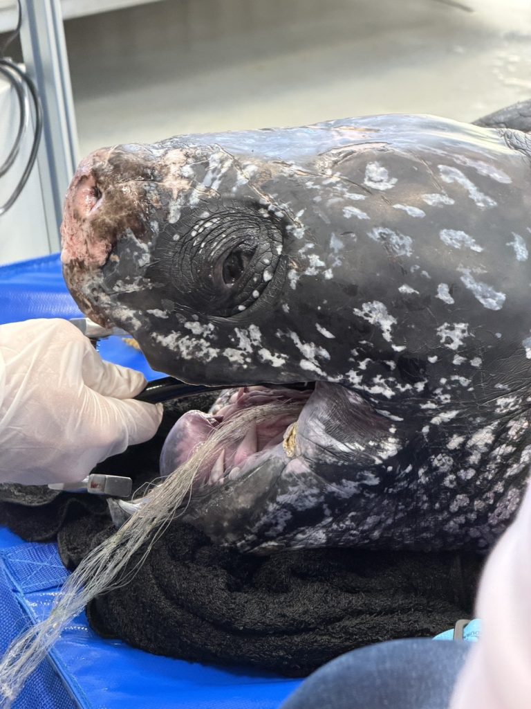 漁民十四日在宜蘭梗枋定置漁場發現一隻革龜受困,相關單位隨即展開救援,將革龜送至八斗子海之生救傷站治療。鯨豚協會十六日偕同台大動物醫院團隊、台北市立動物園醫療團隊,針對革龜腸胃道實施內視鏡漁網移除手術。