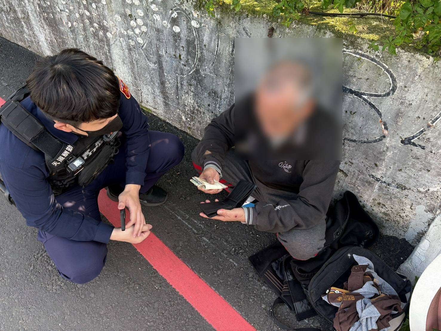 所幸巡邏員警杜炳杰、林偉傑及范冠廷經過南東路南天橋時,發現老翁獨自呆坐在橋上、神情茫然,員警隨即停車上前將其引導至安全地點。然而老翁面對員警詢問,始終無法清楚表達語意,員警見狀,決定先將老翁帶返所內休息。