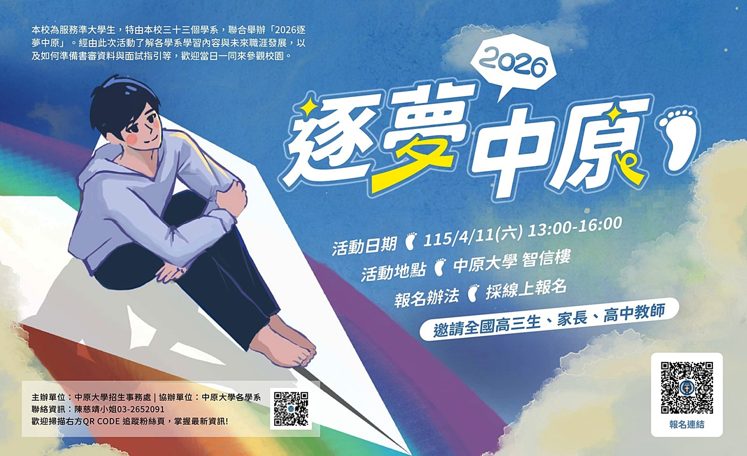 此外,為讓錄取生與家長更深入了解校園環境、學系特色與未來發展,中原大學將於四月十一日(星期六)舉辦「逐夢中原」校園體驗活動,邀請繁星錄取生及對中原大學有興趣的考生與家長踴躍參與。透過實地走訪校園、認識教學資源與聆聽學系介紹,協助準大學生提早規劃未來學習藍圖,開啟逐夢旅程。