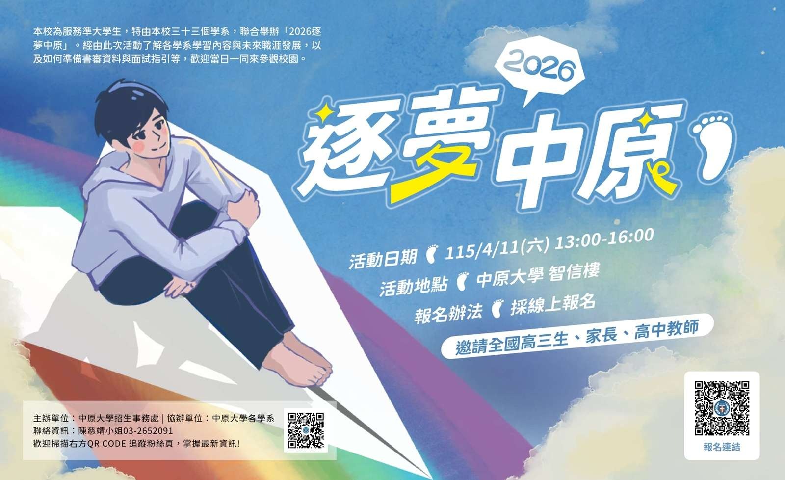 此外,為讓錄取生與家長更深入了解校園環境、學系特色與未來發展,中原大學將於4月11日舉辦「逐夢中原」校園體驗活動,邀請繁星錄取生及對中原大學有興趣的考生與家長踴躍參與。透過實地走訪校園、認識教學資源與聆聽學系介紹,協助準大學生提早規劃未來學習藍圖,開啟逐夢旅程。