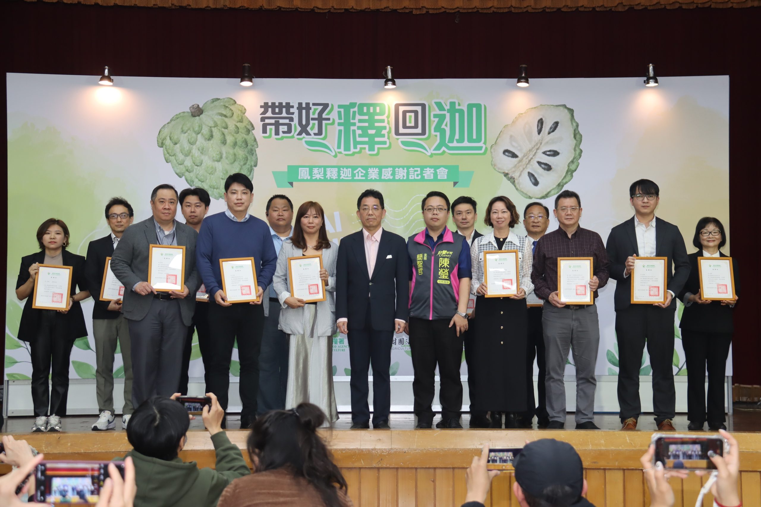 為表揚企業攜手推廣鳳梨釋迦並展現產銷合作成果,農業部農糧署今(18)日舉辦「帶好釋回迦—鳳梨釋迦企業感謝記者會」,邀集企業、通路、加工業者及產地農民團體共同參與,活動特別表揚本(114/115)年期積極推廣鳳梨釋迦的企業,包括台灣肥料股份有限公司、全聯實業股份有限公司、家福股份有限公司、統一超商股份有限公司、全家便利商店股份有限公司及尚順食品有限公司。透過企業採購、通路販售及加工加值等合作模式,不僅拓展鳳梨釋迦銷售管道,也讓更多消費者一同支持國產水果,展現政府、企業與產業齊力穩定農產品產銷的成果。