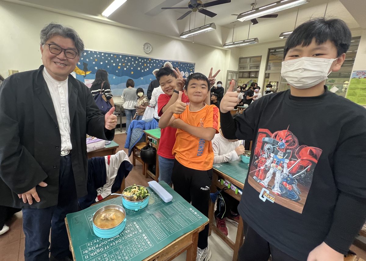 召集人李中赴桃園楊心國小交流考察營養午餐,學生大讚「午餐好好吃」。(記者楊文琳攝)
