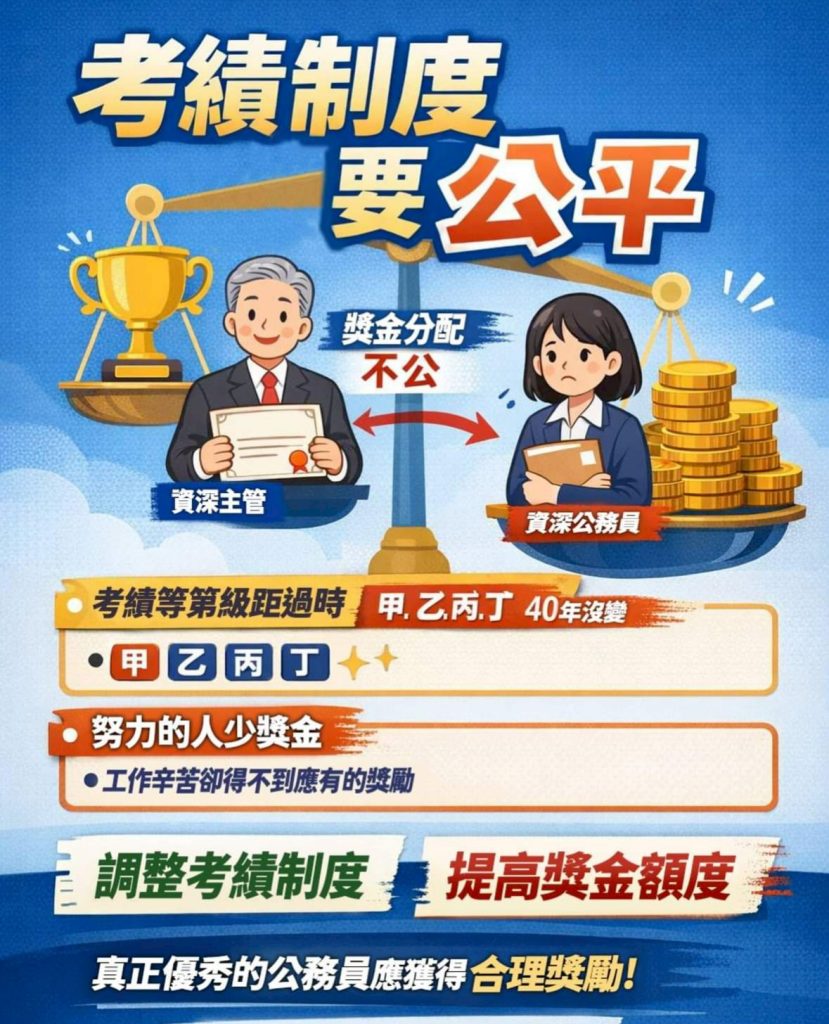 在公務機關裡,行之已久的慣例多是中高階資深公務員 可領到甲等考績獎金,而資淺、低階公務員則多是領乙等獎金;要不就是機關內部人員輪流領乙等獎金, 工作表現無法反映在獎勵制度上,造成不公平的情況。