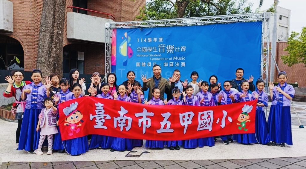 關廟區五甲國小絲竹樂團在剛落幕的「一一四學年度全國學生音樂比賽」中,憑藉如行雲流水般的演奏技巧與震撼全場的團隊默契,於「國小團體室內絲竹樂」項目中,從眾多名校中脫穎而出,奪下最高榮譽「特優」獎座,完成全國賽四連霸壯舉。榮譽背後歸功於兩位傑出校友的長期支持。