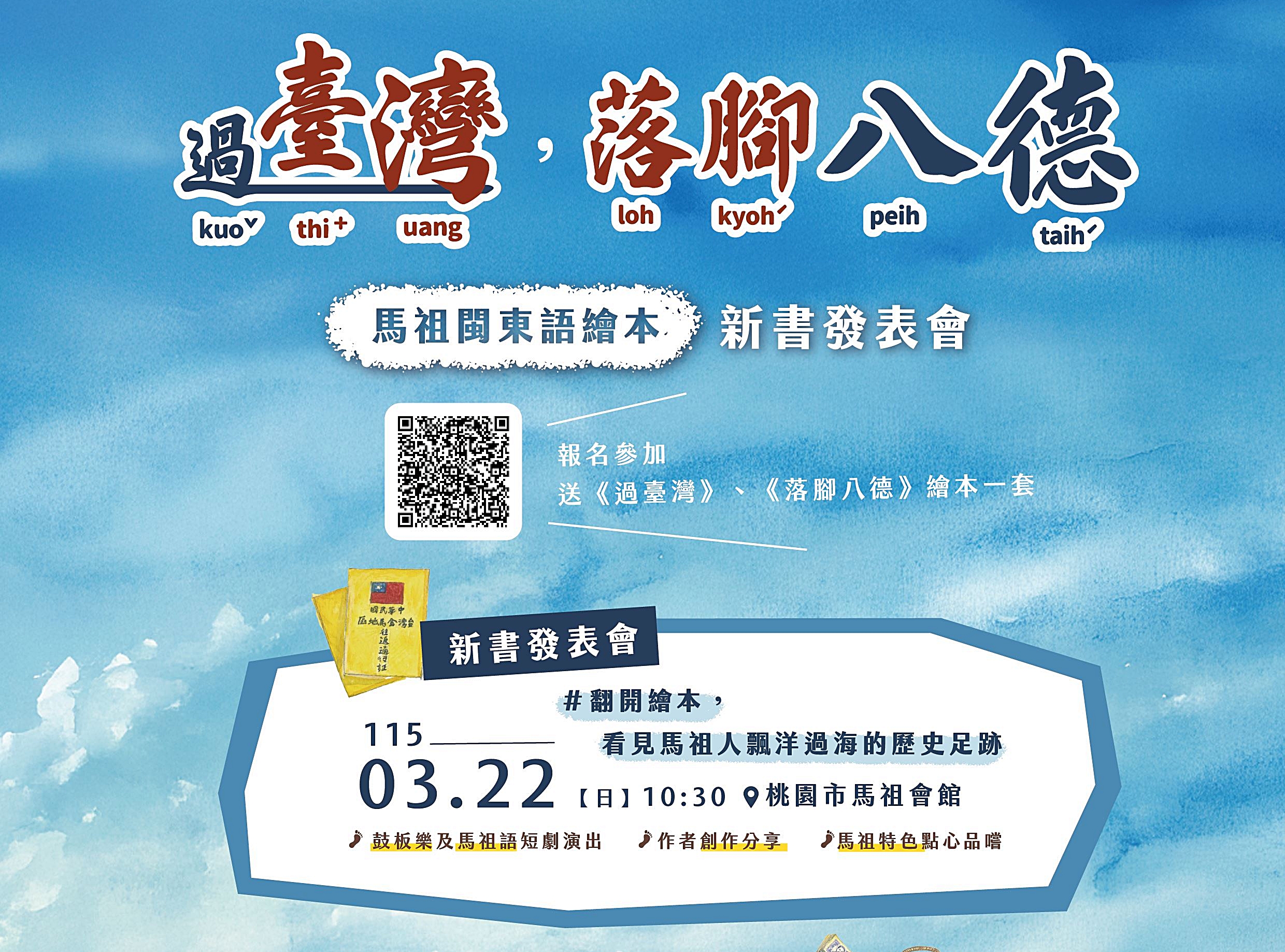 一一五年文化局接續邀請馬祖語專家,將半世紀前馬祖人飄洋過海、遷移桃園的故事,創作成《過臺灣》、《落腳八德》兩冊繪本。書中對於當時馬祖人因受戰爭威脅、生計受困,為追求更美好的生活而遷居臺灣的生命經驗,都有很生動的描述。其次,文字採用馬祖閩東語及華語對照,並且同步出版雙語有聲書的方式,希望讓繪本成為孩子學習母語的教材,也能夠了解馬祖長輩獨特的歷史記憶。