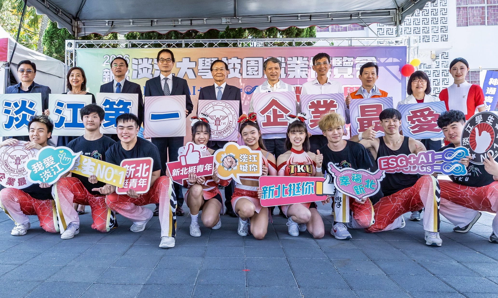 新北市今年校園就業博覽會昨日在淡江大學強勢開跑,淡大校長葛煥昭、勞工局長陳瑞嘉及廠商代表等為學生們加油鼓勵。 (記者吳瀛洲攝)