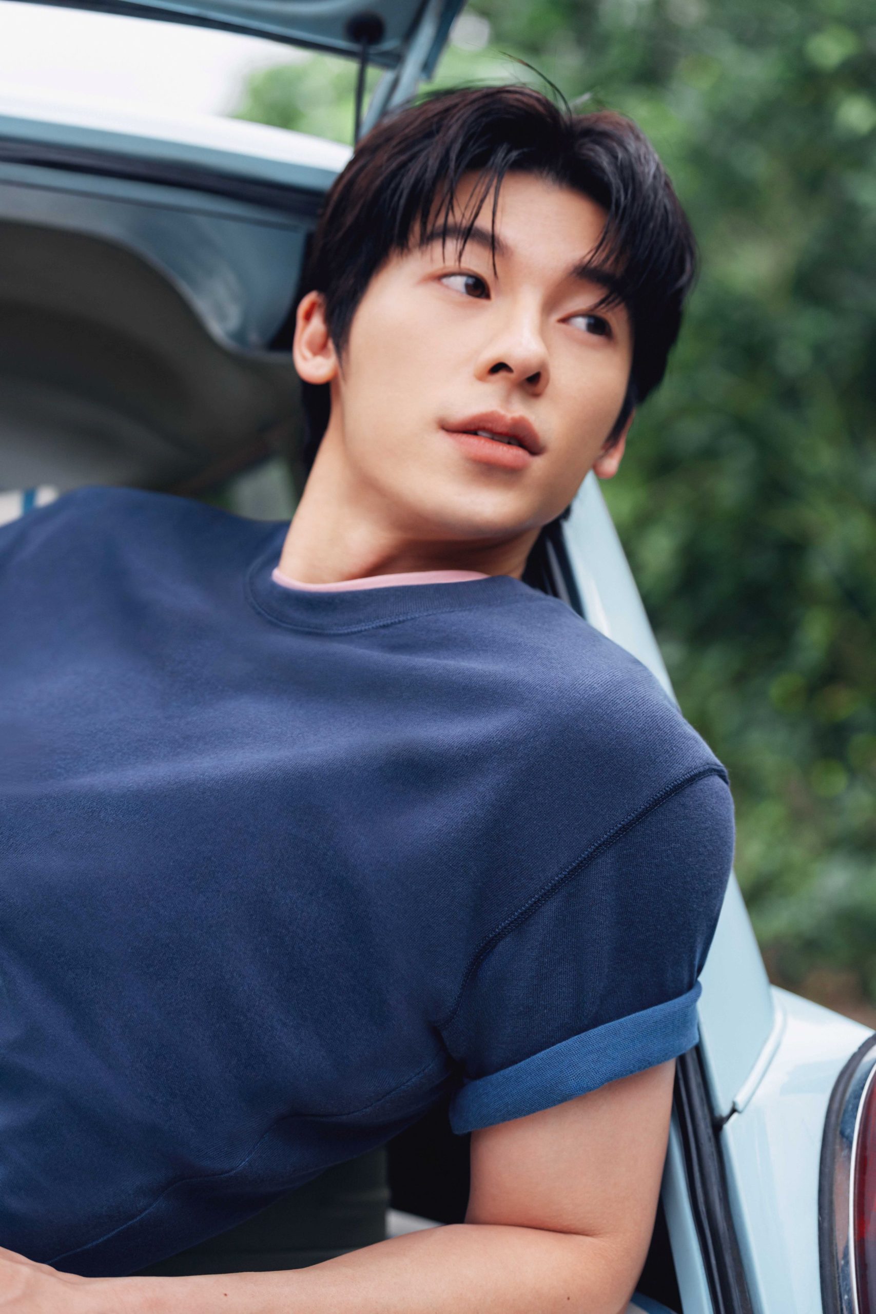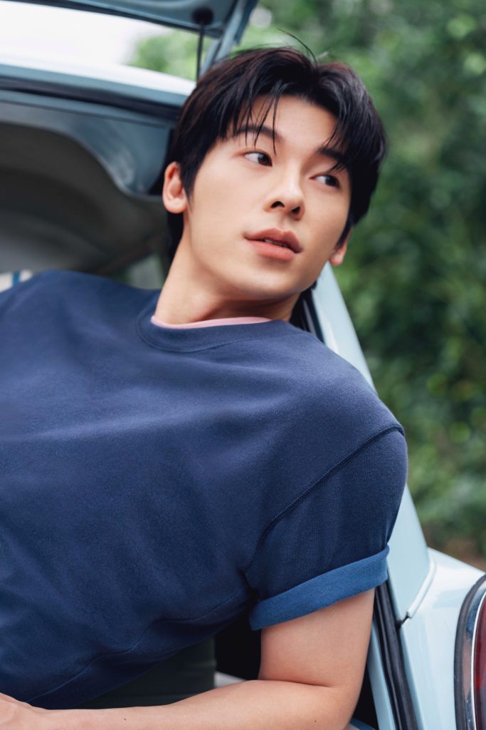 室內靜謐空間中,許光漢以白色UNIQLO and JW ANDERSON聯名「DRY網眼POLO衫」內層疊搭藍色「AIRism棉質網眼POLO衫」,傳遞夏日清新風貌,並透過色彩疊穿打造層次感,讓經典 Polo 穿法展現嶄新風貌。下身搭配「寬版牛仔褲」,寬鬆比例與俐落上身形成鮮明對比,一穿更顯高!不僅凸顯褲裝的份量感,也讓整體輪廓線條更具新鮮感!