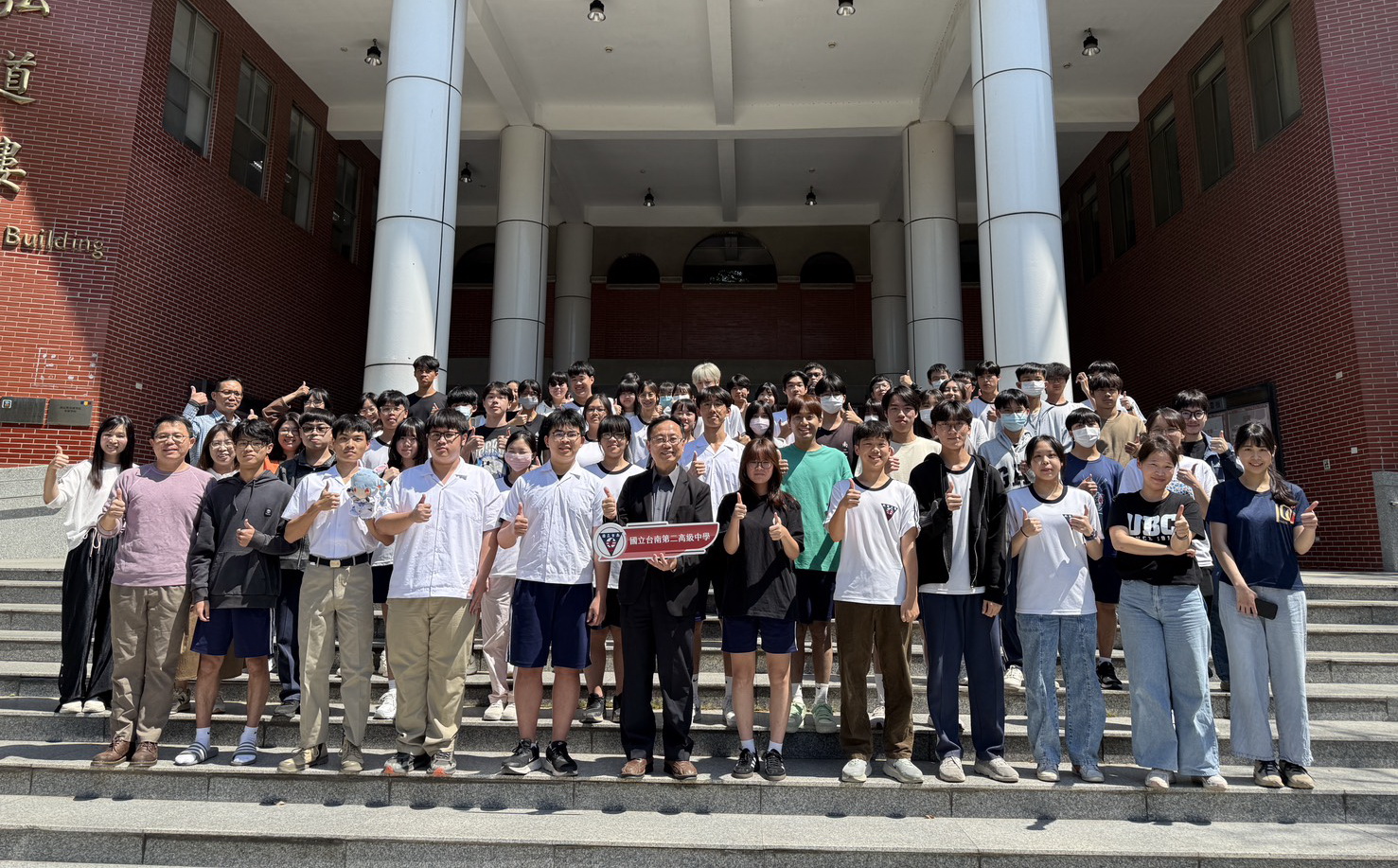 台南二中今年“繁星璀璨”,六十三位錄取考生在校園合影慶祝。(台南二中提供)