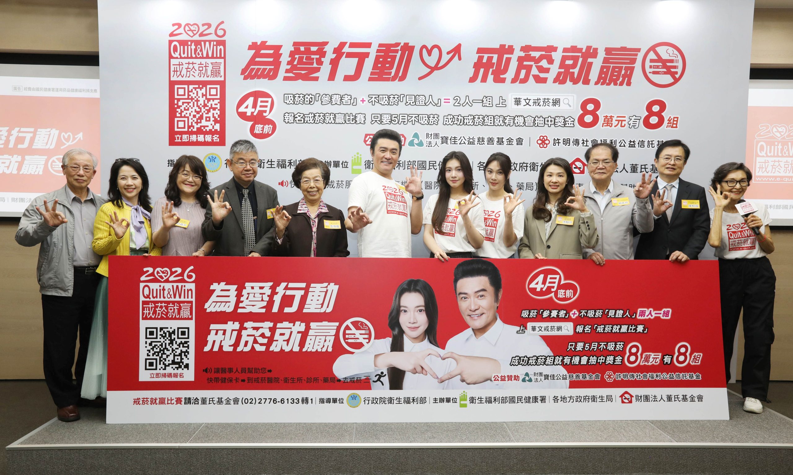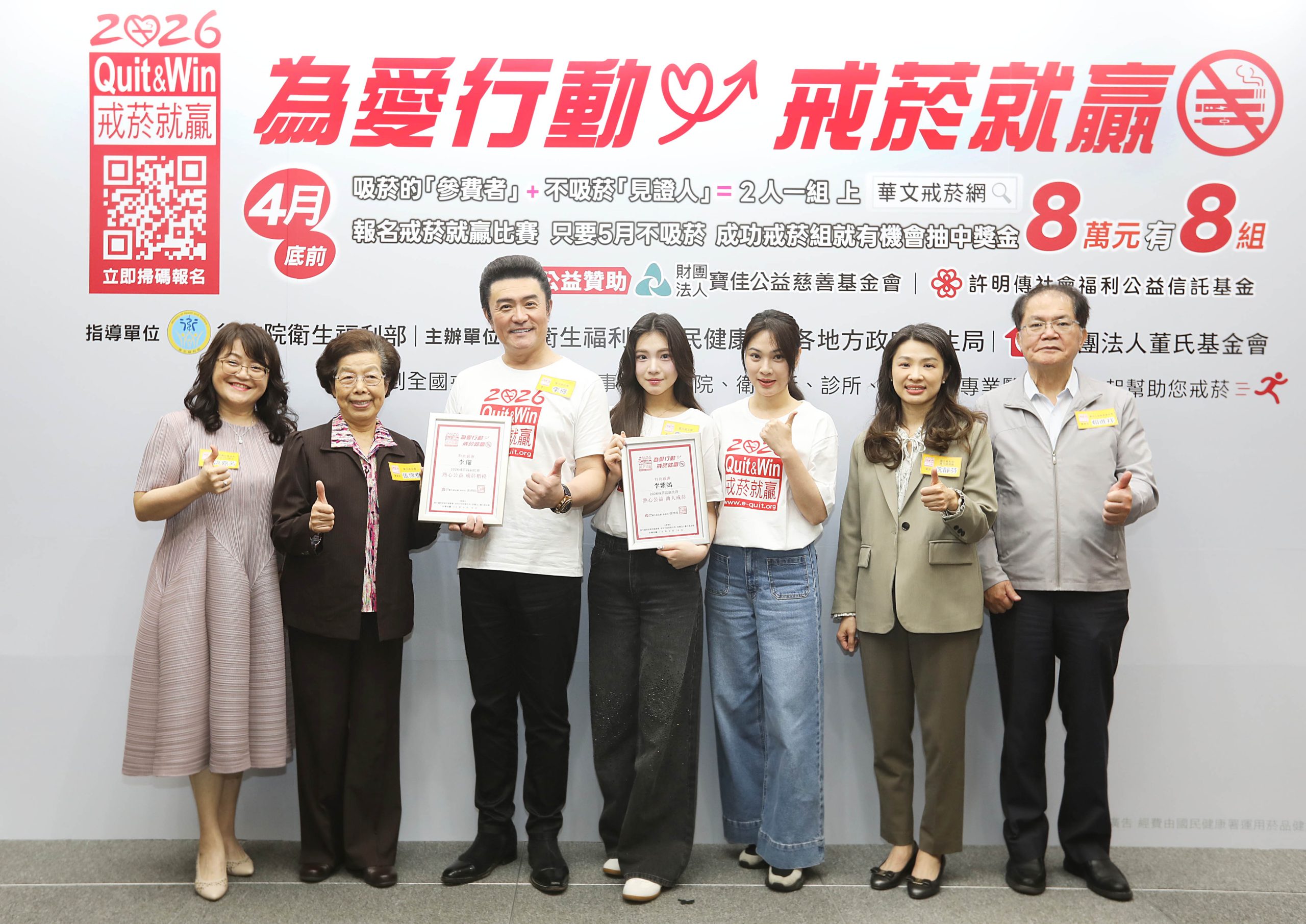 「2026戒菸就贏比賽」19日宣布報名開跑。國民岳父李 及女兒李紫嫣合體號召「為愛行動、戒菸就贏」,民眾只要成功完成戒菸挑戰,就有機會抽中8萬元成功戒菸獎,共8組名額。今年也首度將協助戒菸的醫事人員納入獎勵對象,一起助攻參賽者擺脫菸癮。