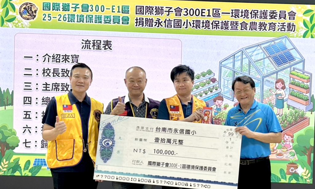 永康區永信國小推動生態教育,攜手國際獅子會300E1區環境保護委員會,正式啟動「空中溫室」生態基地,透過十萬元經費挹注,將原本單調的校舍空間轉化為結合自然、生態與科技的永續學習場域,為校園寫下嶄新的綠色篇章。