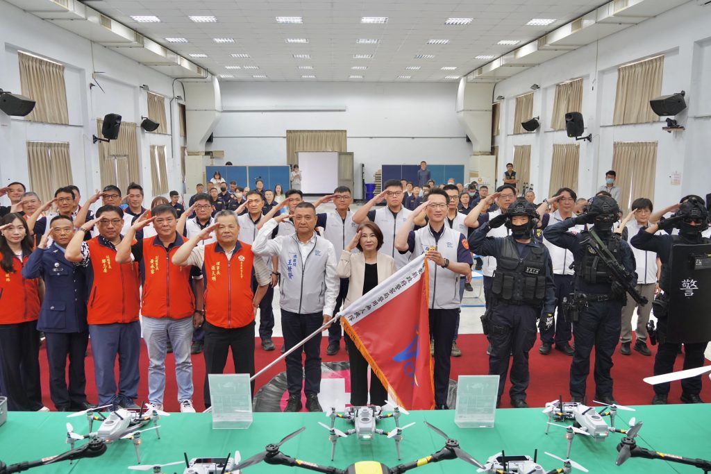 屏東縣政府警察局20日宣布正式成立「警用無人機隊」,由縣長周春米主持授旗典禮,象徵屏東警政邁入全新時代,該無人機隊由16名取得專業證照警員組成,可運用於大型活動維安、交通流量監控及夜間熱成像搜索,透過科技導入勤務、提升偵防效能,協助指揮官即時決策與各類突發狀況,全面強化治安維護能量,守護縣民安全。