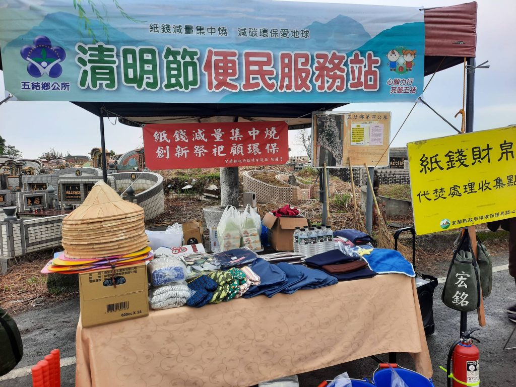五結鄉公所將於清明節當日於六處便民服務站免費向前來祭祀祖先的民眾提供祭掃工具。另為宣揚環保祭祀之減碳理念,除縣環境保護局所提供之宣導品外,鄉公所也準備了各類宣導品(如斗笠、保溫袋、隔熱手套、圍裙等)來換取掃墓鄉親的紙錢,希望持續推展紙錢減燒的好觀念。