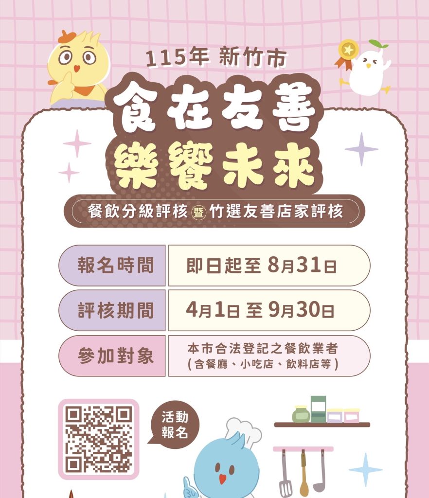 衛生局鼓勵竹市餐飲業者踴躍參與分級評核及高齡友善標示制度,透過專業評比與營養評估機制,持續精進食品安全與高齡友善服務品質,共同守護市民健康。報名期間自即日起至八月三十一日,相關資訊及報名方式請至新竹市衛生局網站( https://dep.hcchb.gov.tw )或新竹市衛生局臉書粉絲專頁查詢。