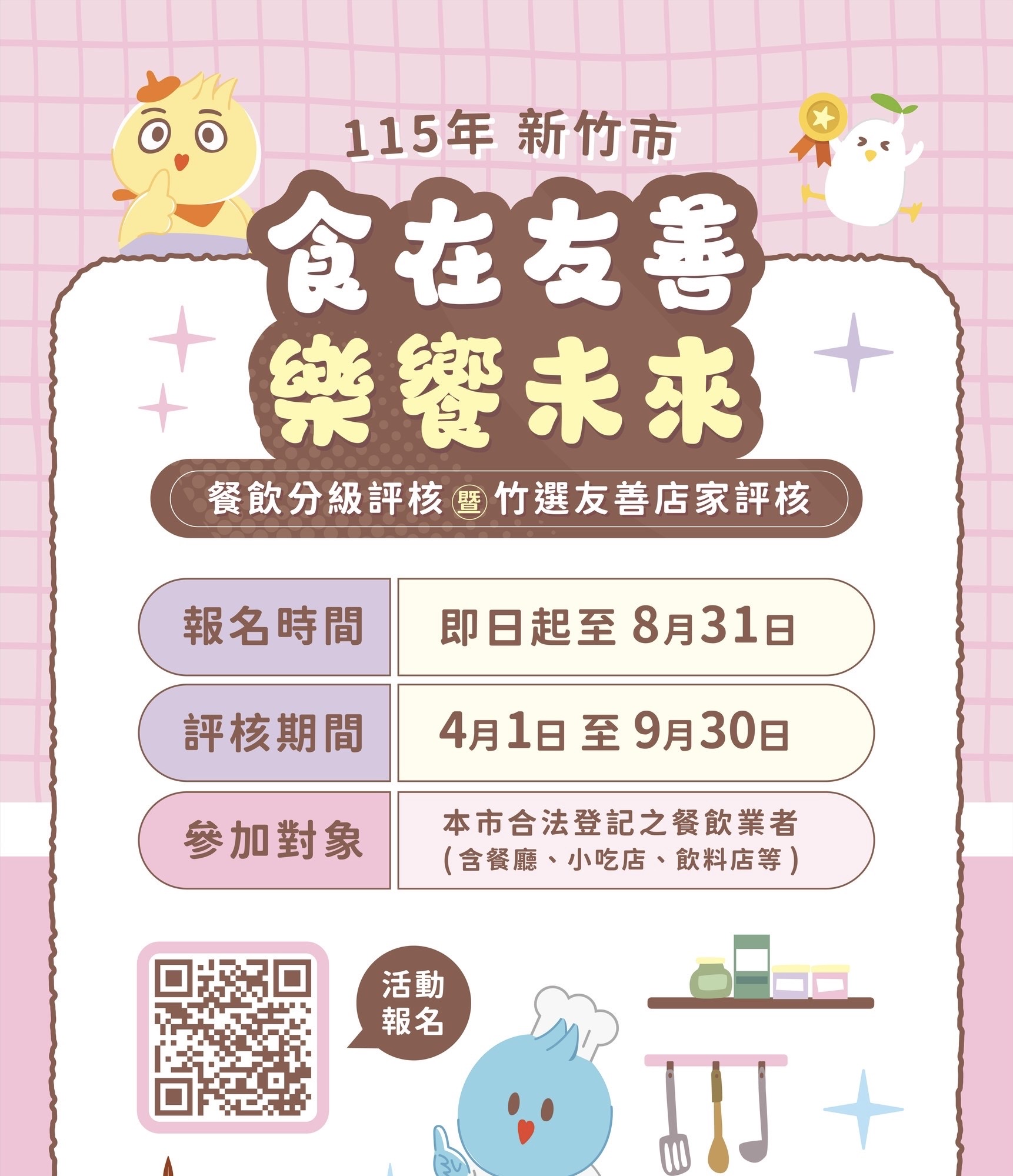衛生局說明,凡設立於竹市且依法完成商業或公司登記或攤販許可,並完成食品業者登錄之餐飲業者,均可報名參加此次評核。獲得「優」及「良」級之餐飲業者,可進一步申請「竹選友善」標示,「竹選友善」會經由營養師依七大面向進行評估,通過後亦將頒發其標示,以供業者張貼於門口,協助長者在選擇餐廳時能夠清楚辨識,適合自身牙口之餐食,提升用餐品質。