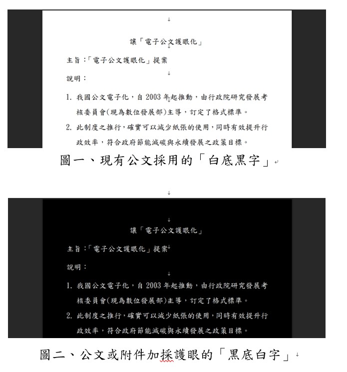 《光與健康協會》理事長、新竹清華大學特聘教授周卓煇指出,電子公文取代紙本文件,確實能大幅減少紙張使用,但螢幕長時間釋放的藍光,對視力的潛在傷害不容忽視。他建議,將電子文件由傳統的「白底黑字」改為「黑底白字」,可有效降低眼睛負擔,達到「省紙又護眼」的雙重效益;若使用者一時難以適應,也可採雙版本並行方式,逐步轉換閱讀習慣。