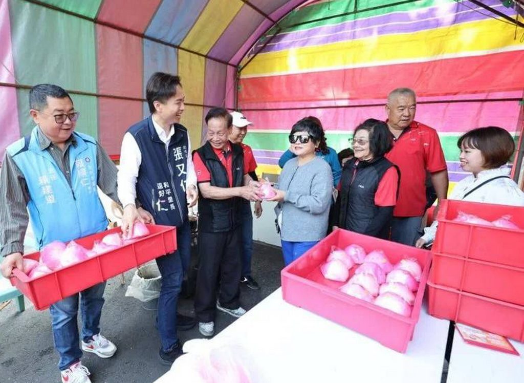 和平里福德祠主委蔡安偕同張又仁、市議員賴順仁議員服務處主任賴建道,以及委員會幹部們共同發放一千八百顆壽桃等各項結緣品,很快就被索取一空。