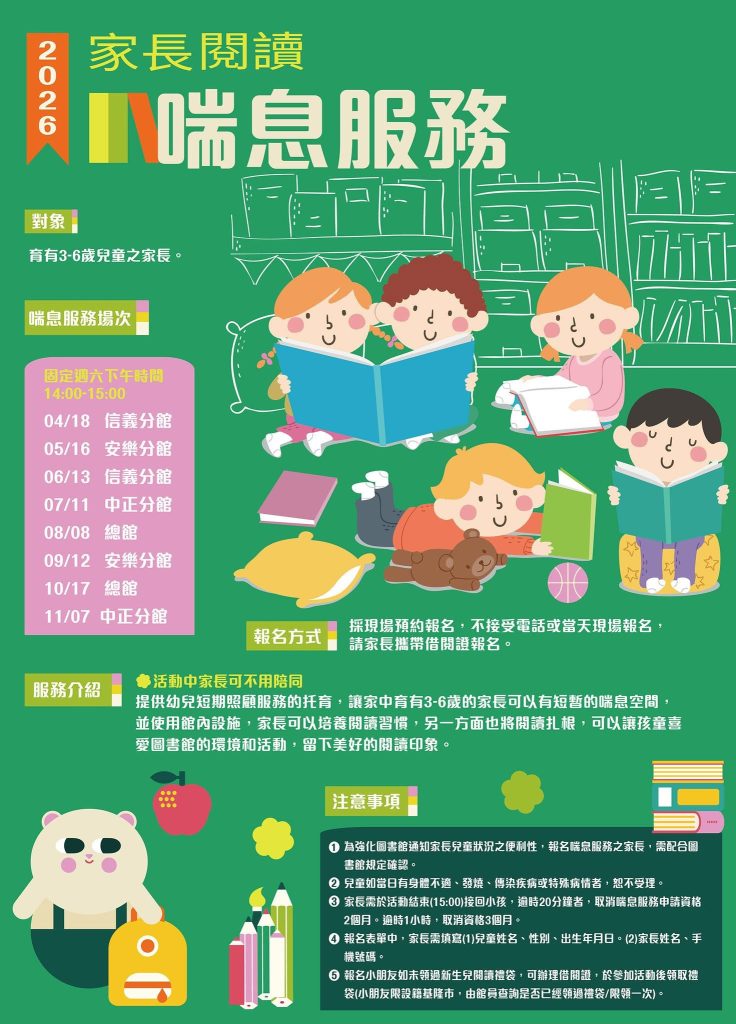 基隆市公共圖書館推出全新閱讀推廣服務,結合育兒支持與閱讀培養,於一一五年規劃辦理「家長閱讀喘息服務」,針對育有三至六歲幼兒之家長提供短時托育協助,讓家長在安心環境中享有片刻喘息,同時培養閱讀習慣,亦讓孩童從小親近書香,深化閱讀基礎。