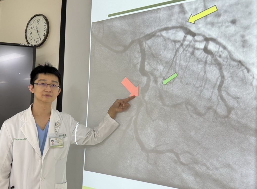 衛生福利部台中醫院心臟內科醫師黃聖瑋指出,患者到院急診時主訴胸痛跟冒冷汗,急診團隊一抽血檢查,發現心肌酵素超標,懷疑心肌梗塞,除了立即施打抗凝血劑,進一步進行心導管檢查,果然發現患者左前降支、左迴旋支、右冠狀動脈都嚴重狹窄。