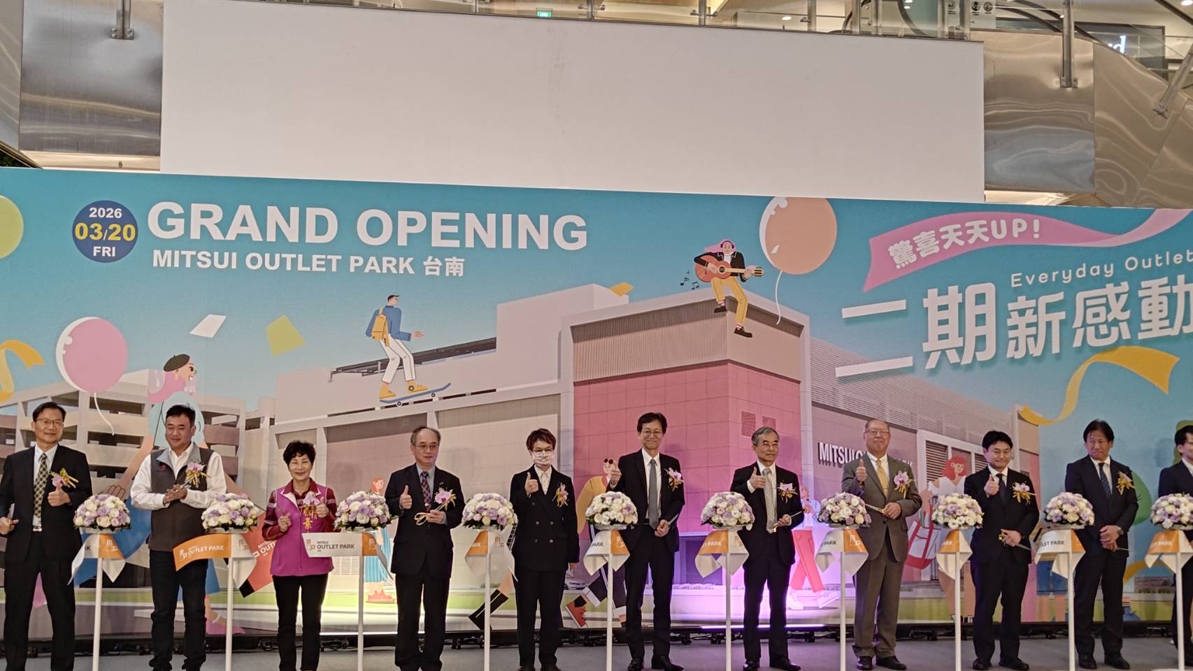 二十日上午舉行的開幕剪綵儀式,並由三井不動產副社長山本隆志、台南市副市長趙卿惠、該專案地主代表交通部鐵道局副局長呂新喜、日本台灣交流協會高雄事務所奧正史所長等重量級貴賓親自主持。