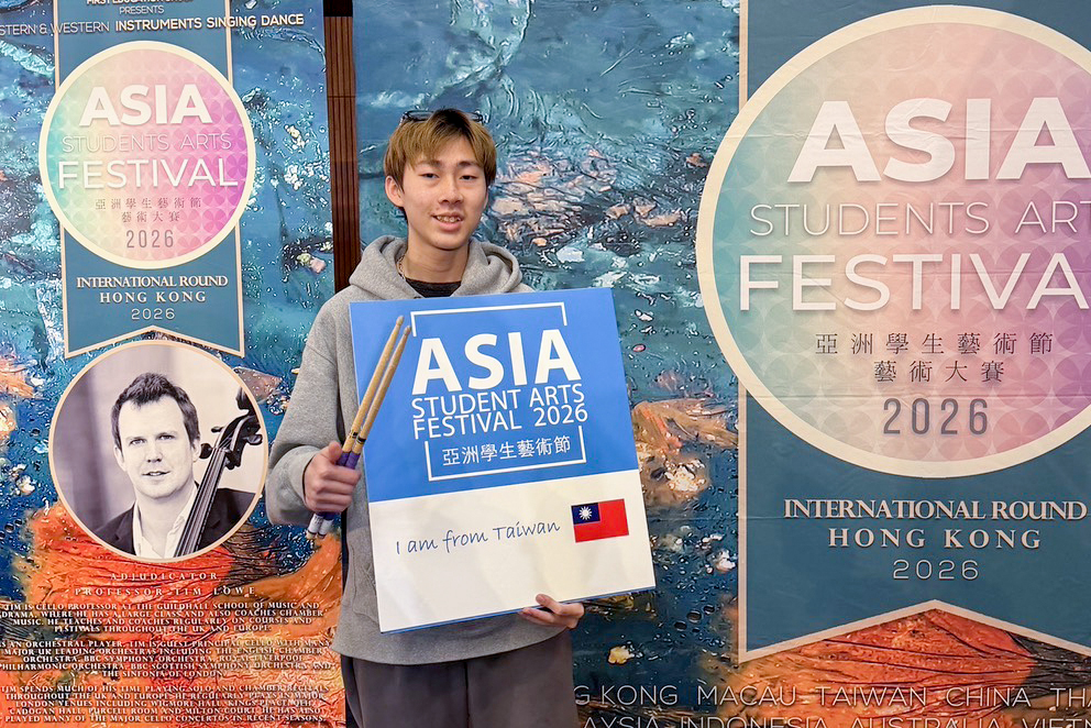在舞台經驗方面,他從桃園地方性比賽起步,逐步參與各類大型賽事,持續累積演出與比賽經驗。此次在第四屆亞洲國際爵士鼓大賽奪下總冠軍,對他而言不只是一次成績上的肯定,更是長期努力後的重要里程碑。