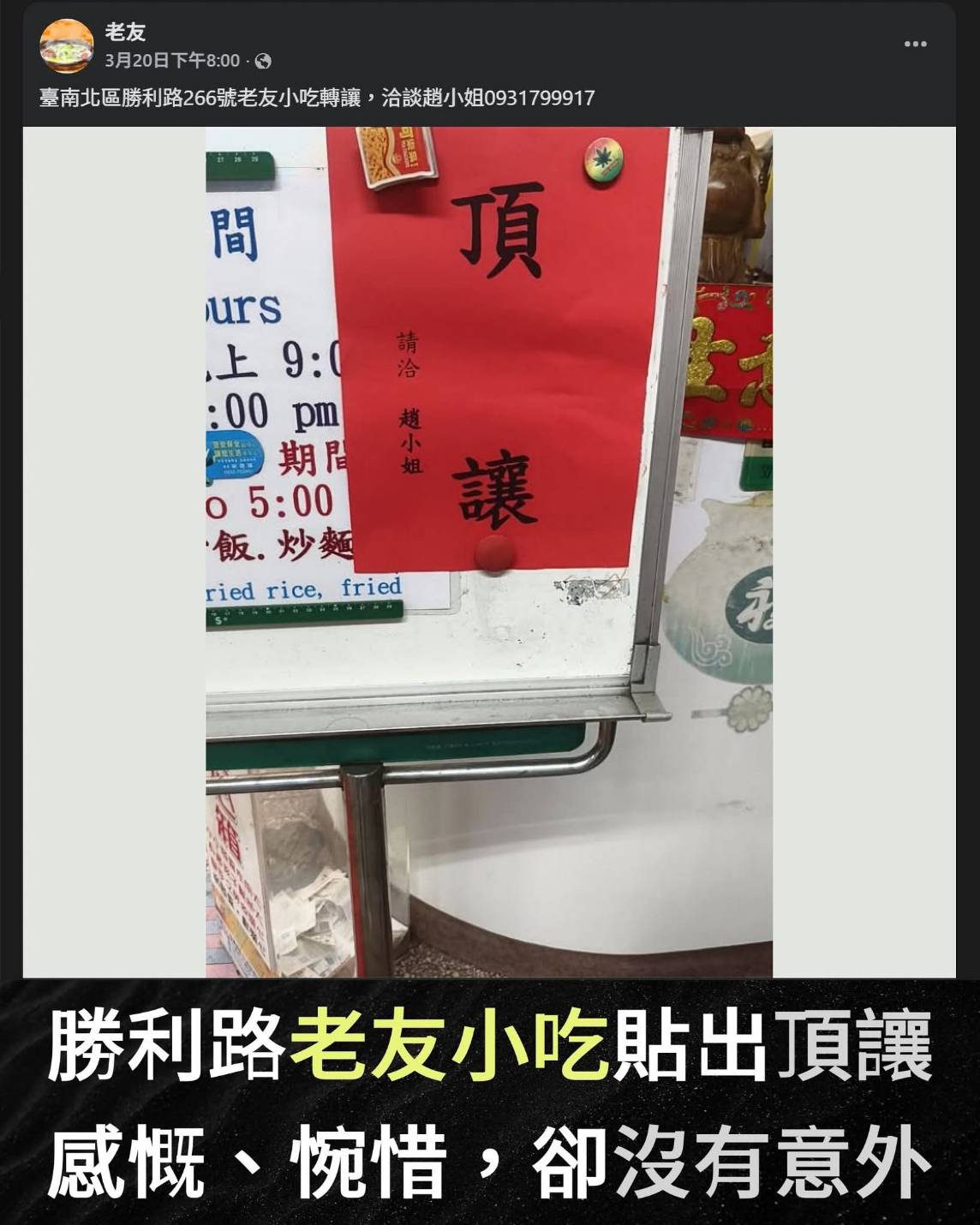 台南勝利路老字號「老友小吃店」貼出頂讓公告,引發民眾感嘆與不捨。(記者林怡孜翻攝自網路)