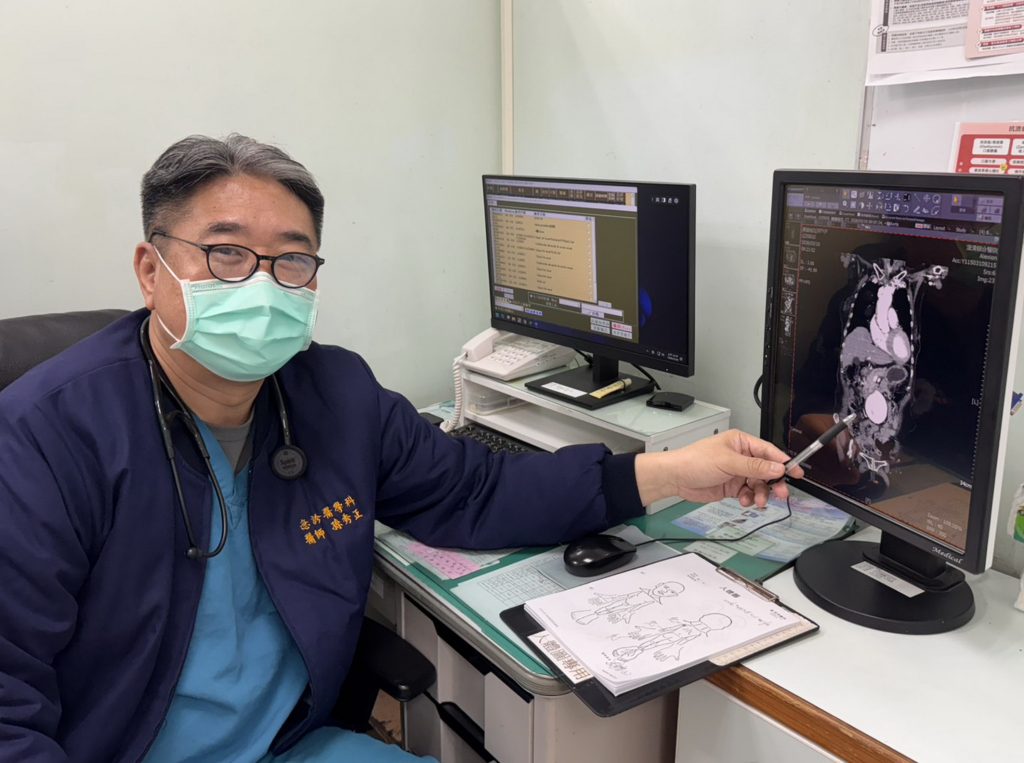 這位高齡患者由家屬陪同到急診求診時,一再強調她左側下肢痠痛及腰部不適,但並沒有明顯外傷史,其疼痛指數已達到8至10分,為了快速釐清病情,平等澄清醫院急診室主治醫師孫秀正立即為病人進行床邊超音波檢查,發現患者的腹主動脈明顯擴張,直徑已超過7公分,高度懷疑為腹主動脈瘤,進一步安排電腦斷層檢查確認診斷,結果顯示確實為大型腹主動脈瘤。